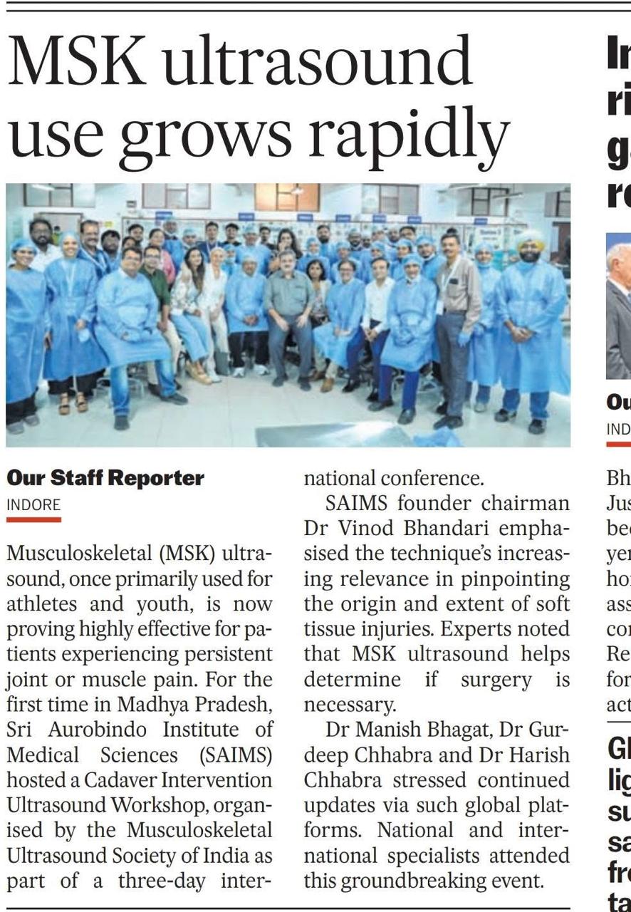 Indore witnessed a convergence of medical brilliance as the Musculoskeletal ultrasound society of India orchestrated a pioneering conference on musculoskeletal ultrasound on 2nd , 3rd , 4th may 2025. Held at a SAIMS Indore, the event drew esteemed experts from around the globe, alongside distinguished national and international faculty, to delve into the intricacies of musculoskeletal ultrasound.